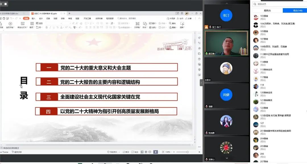 姜汪维老师从党的二十大的重大意义和大会主题、报告的主要内容和逻辑结构、全面建设社会主义现代化国家关键在党和以党的二十大精神为指引开创高质量发展新格局四个方面进行解读。并聚焦报告的最后一个部分“坚定不移全面从严治党,深入推进新时代党的建设新的伟大工程”,他从新变革、新境界、新任务和新伟业四个部分详细解析。