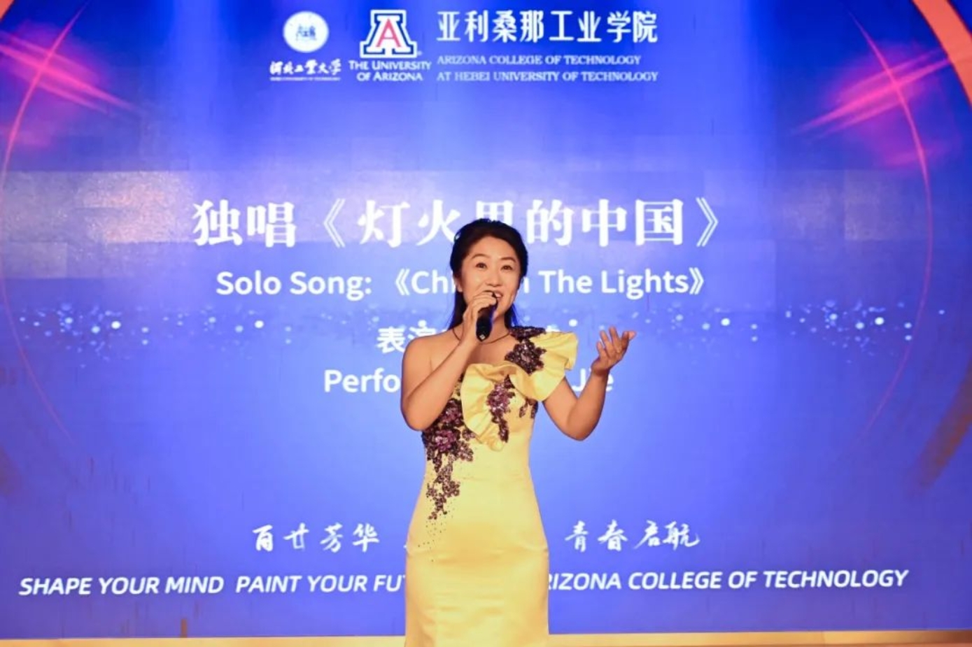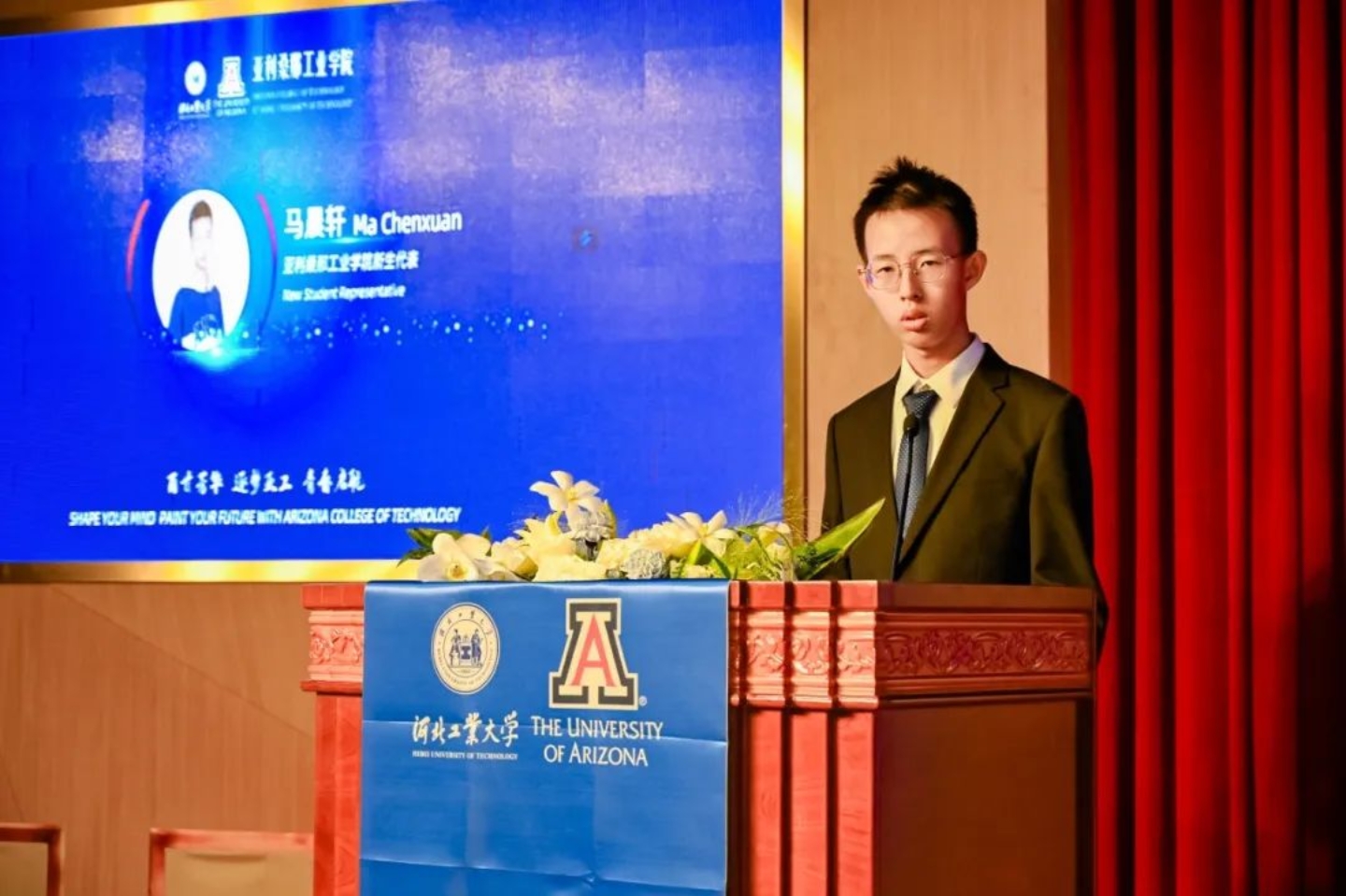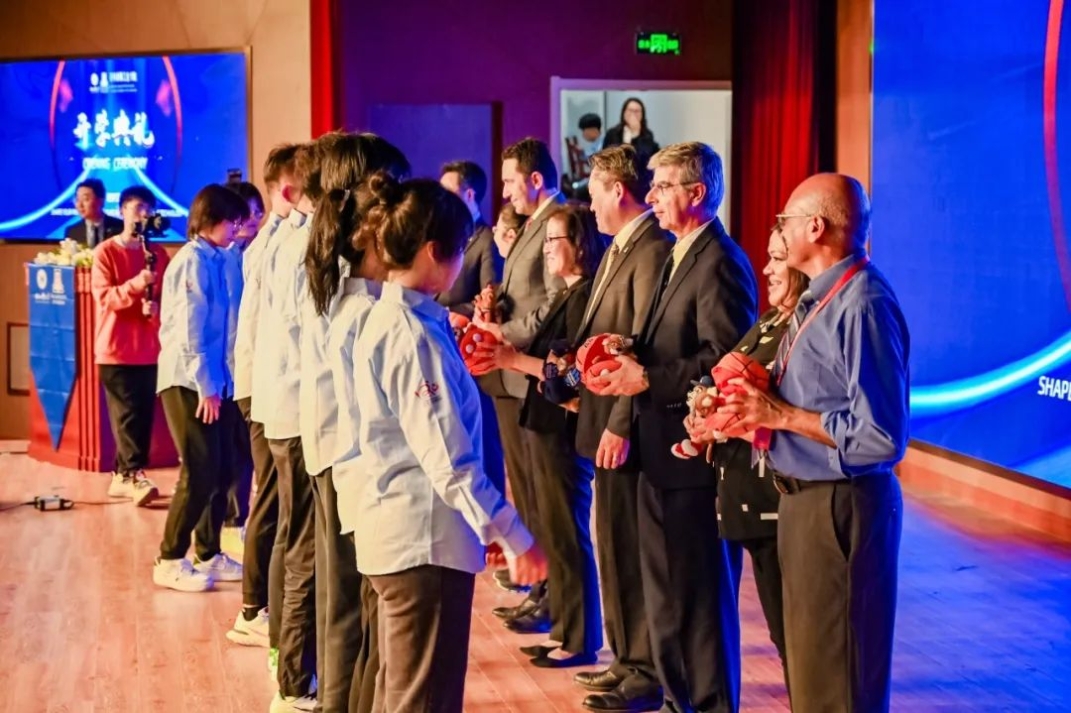 伴随着《燃情岁月》气势恢宏的音乐,来自亚利桑那大学的老师们为同学们赠送了象征无所畏惧、勇往直前精神的吉祥物-WildCat。河北工业大学的老师们为学生代表佩戴校徽,别在胸前的校徽熠熠生辉,满载着河工百廿发展历程,激励着亚工学子奋发有为。