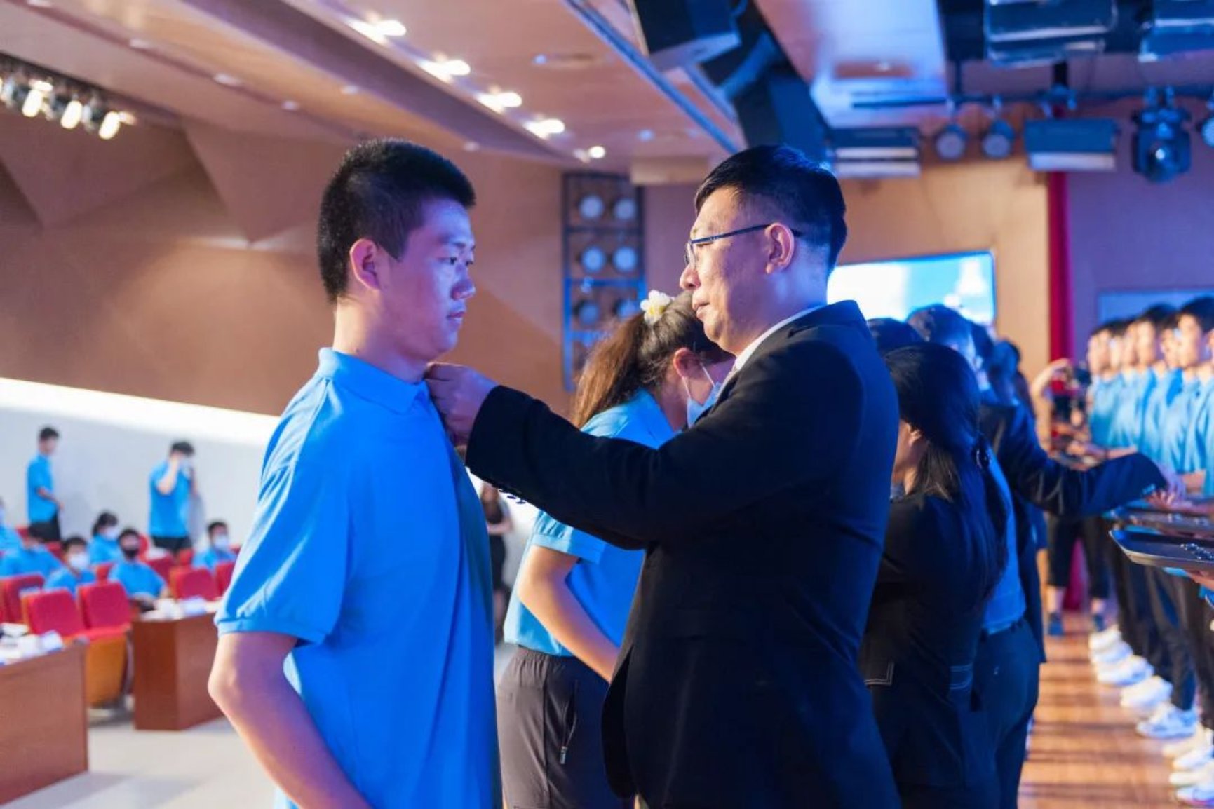 “铁锤铛铛,书声琅琅,勤慎公忠为理想;桃花灼灼,北运汤汤,工学并举薪火长”伴随着悠扬的校歌,老师们为全体新生一一佩戴校徽,同学们完成了成为一名“大学生”身份的蜕变。