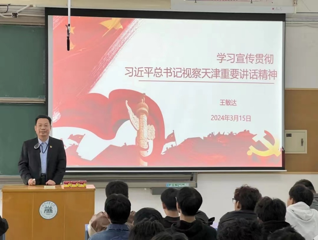 王敏达老师带领同学们回顾了习近平总书记在天津视察指导工作,从习近平总书记深入农村、历史文化街区、革命纪念馆考察调研、看望慰问基层干部群众等方面进行了梳理和解读。他指出,习近平总书记于春节前夕来到天津考察,更显温暖与深意。节前看望慰问的行程体现出习近平总书记对民生的关心和关注,对经济的促进与发展具有深刻的战略意义。